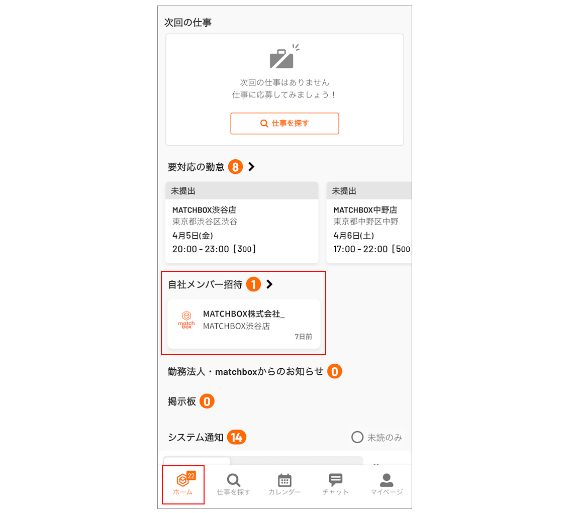 ①【ホーム】の「自社メンバー招待」で法人名を押す