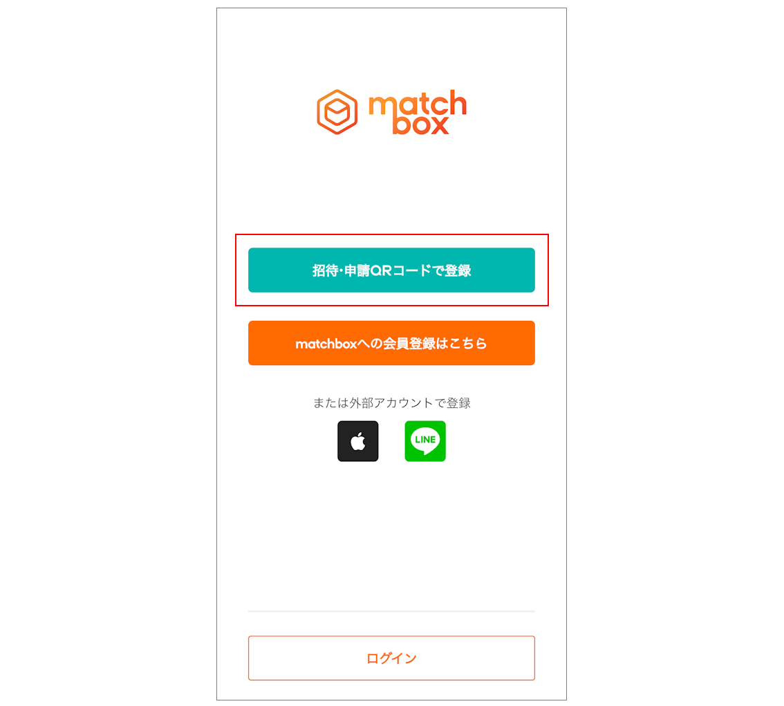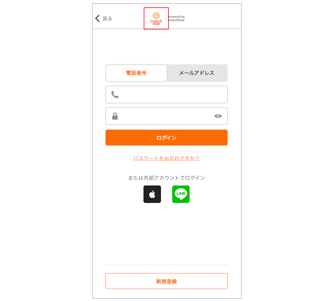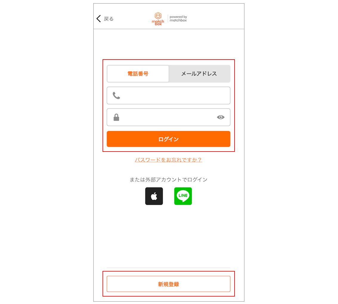 ⑤matchbox登録済みの場合:電話番号またはメールアドレスとパスワードを入力して「ログイン」を押す