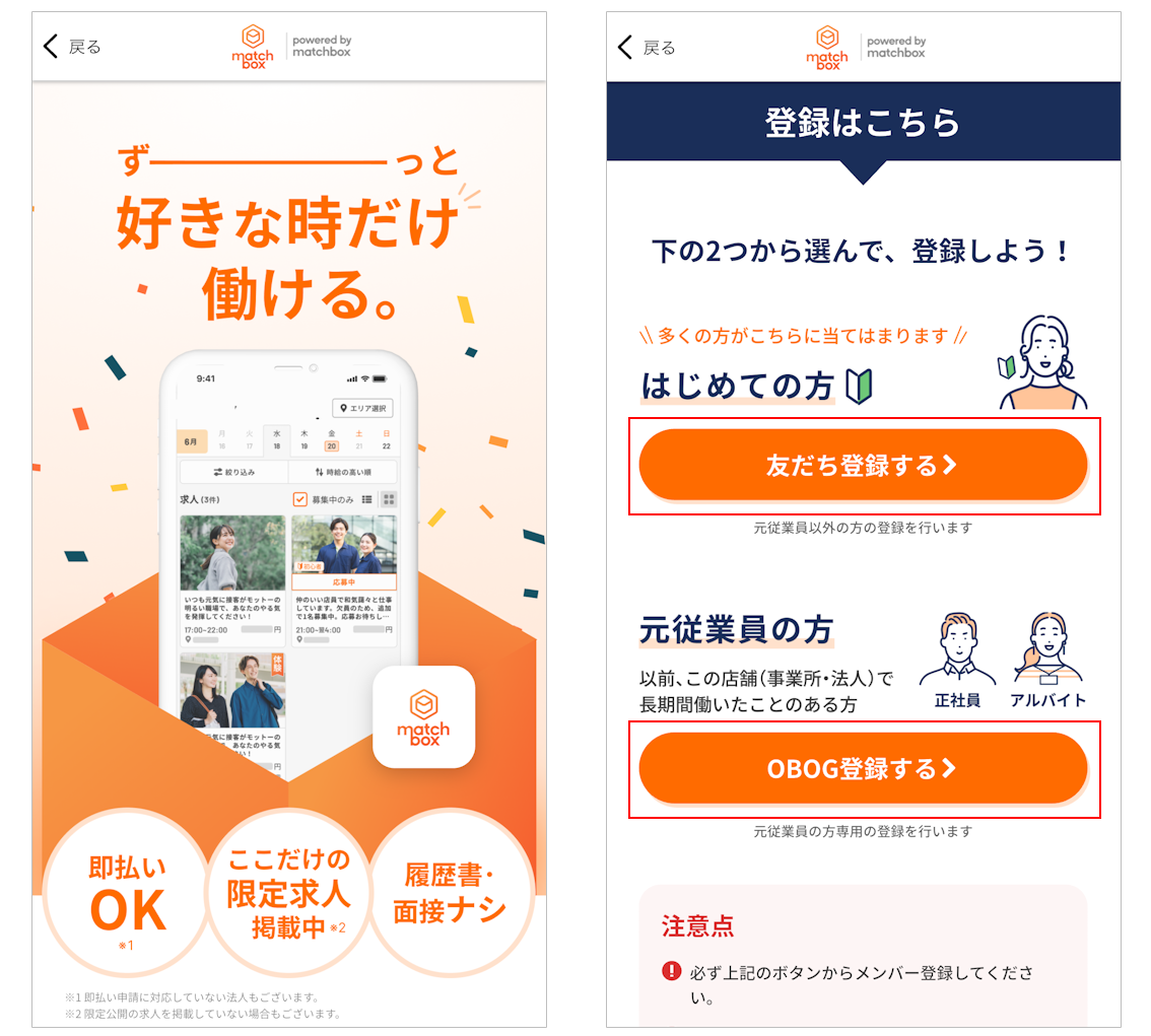③こちらの画面が表示された場合は下にスクロールして「友だち登録する」または「OBOG登録する」を選択する
