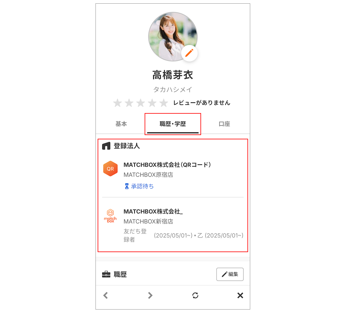 アプリの【マイページ】▶「プロフィール」にある、「職歴・学歴」タブ より、現在の自社メンバー登録/承認ステータスをご確認いただけます。
