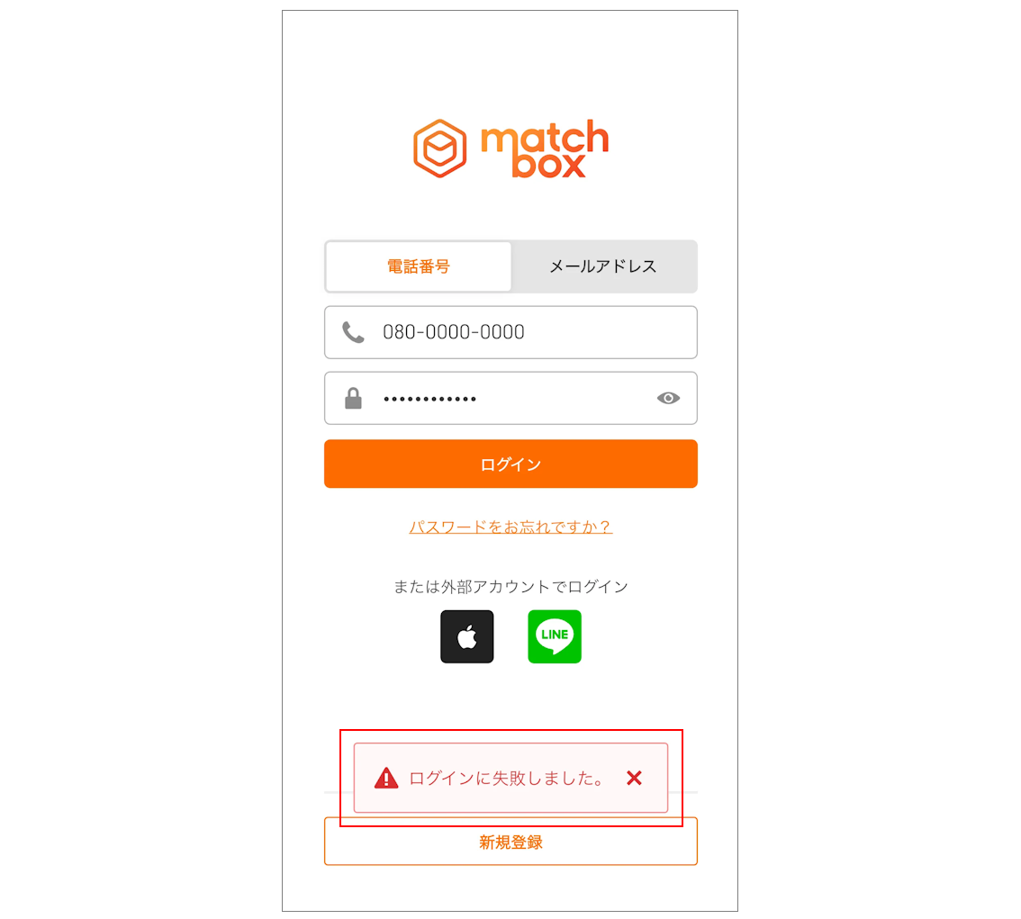 入力内容が登録情報と一致しない場合、「ログインに失敗しました。」というエラーメッセージが表示されます。