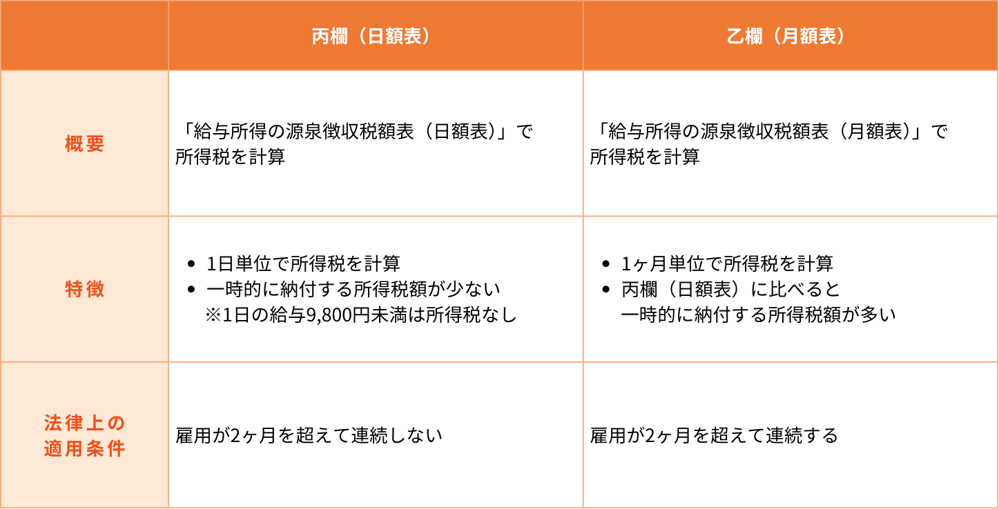 matchboxに掲載されている求人では、「丙欄(日額表)」または「乙欄(月額表)」のいずれかの所得税区分が適用されます。