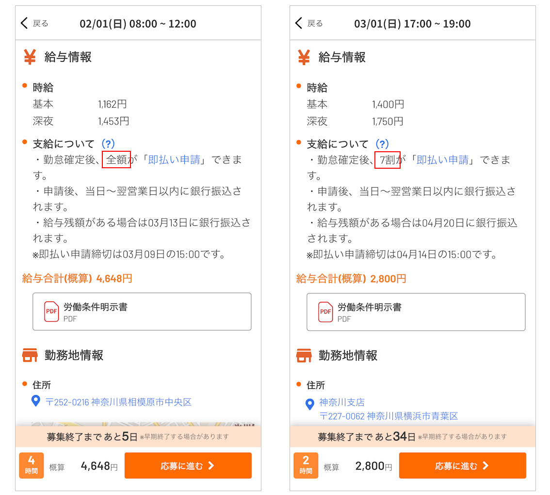 求人詳細画面の「支給について」に記載される、即払い申請の割合で判別できます。