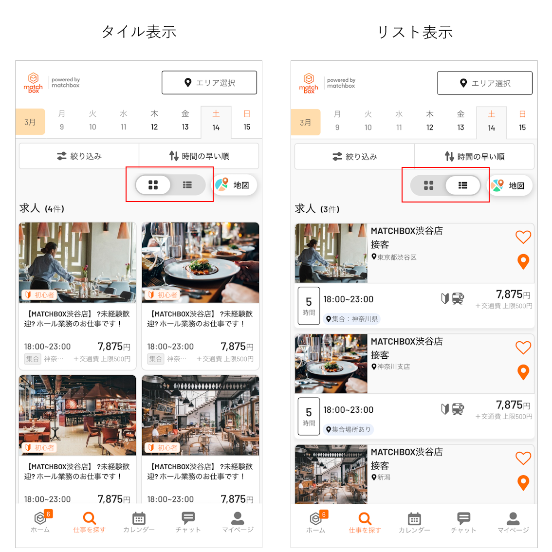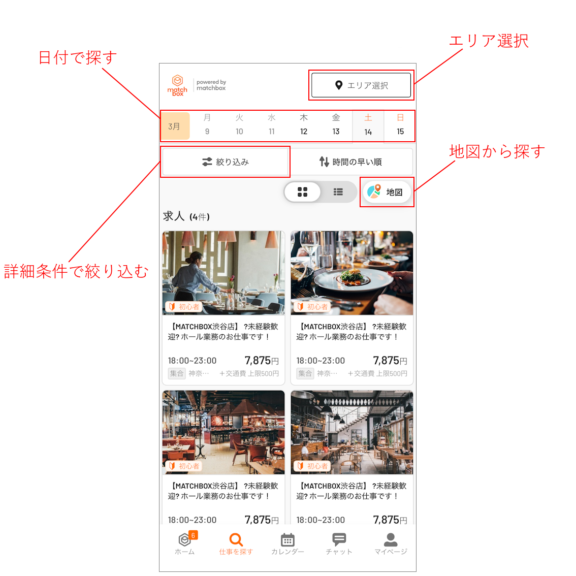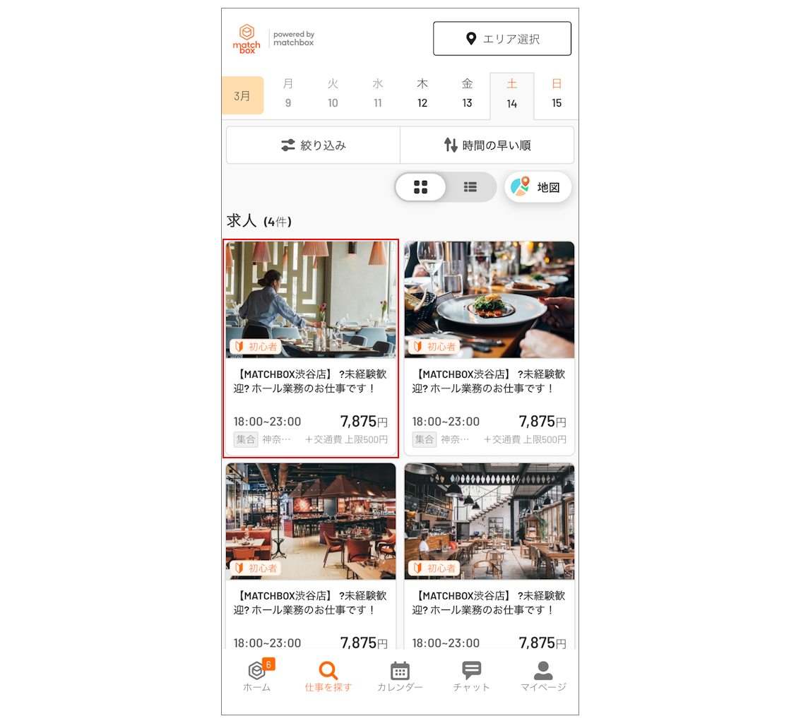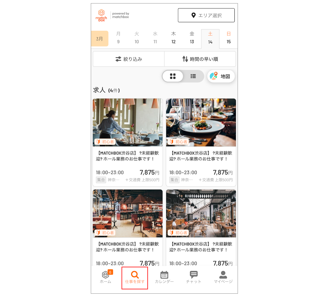 検索画面上部の日付から、働きたい日を選択できます。