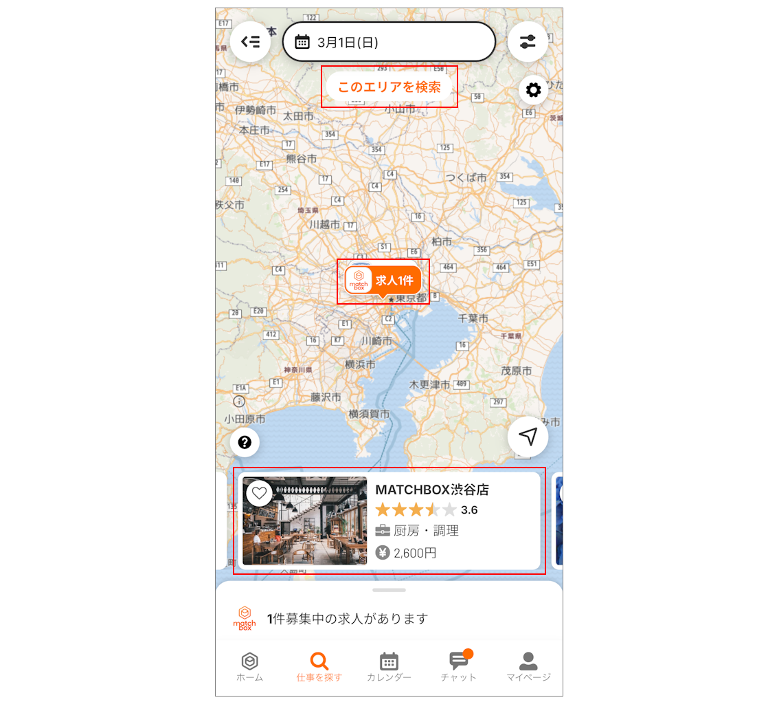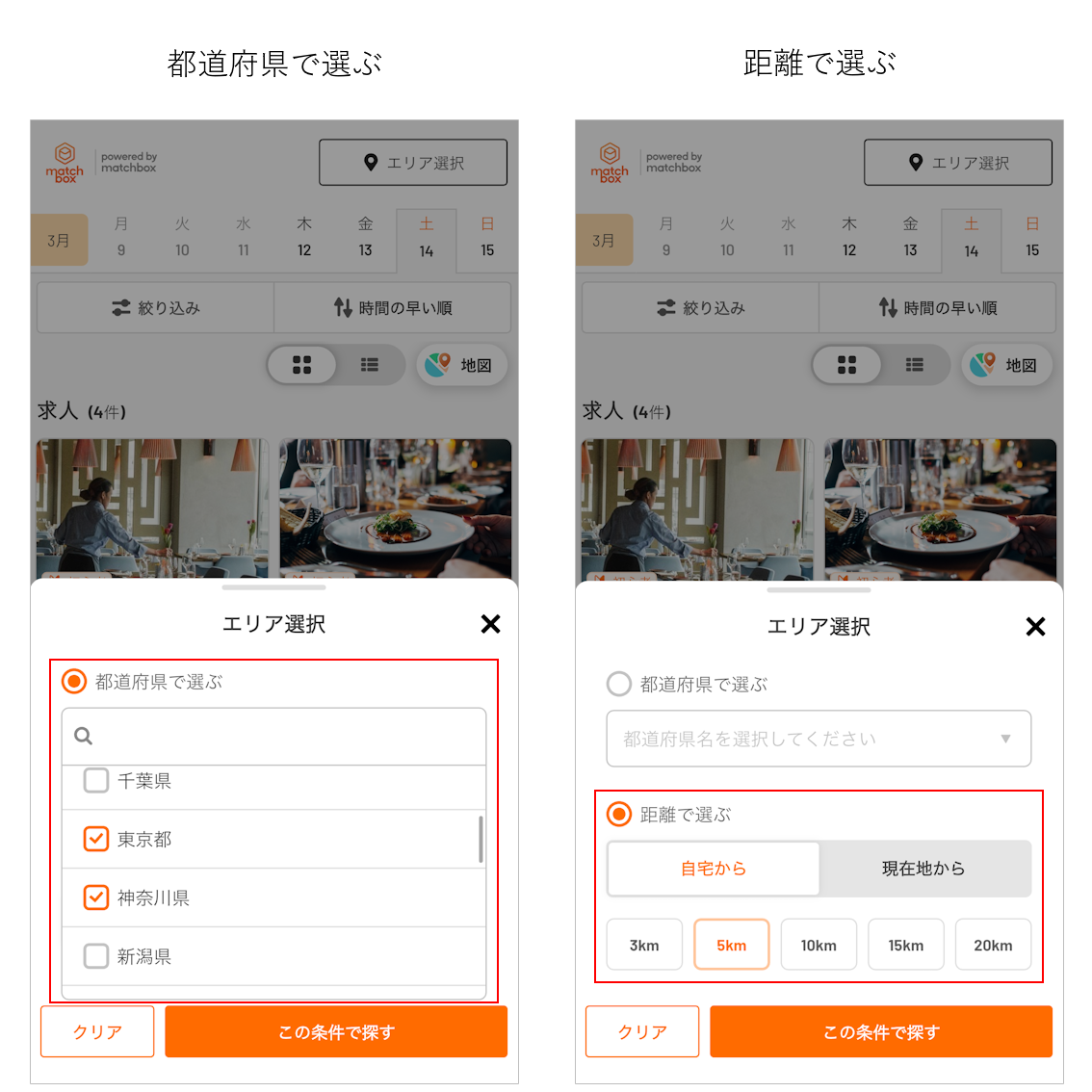 ※「自宅から」を選択した場合、matchboxに登録済みの住所を基準にします。
